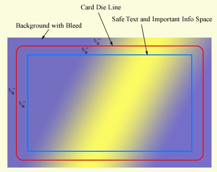 Bleed: If you have an image, graphic or color up to the edge of the card you must add a bleed. All card printing jobs require a minimum of 1/8" (3mm.) outside the final trim area for bleed. Avoid placing text and other important elements within 1/8" (3mm.) of the edge of your card to allow for slight movement during cutting.